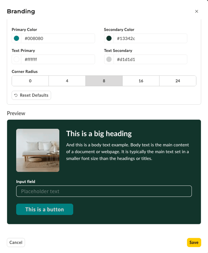The color preview updates live at the bottom of the Branding panel, so you can instantly see how your selections look in context.